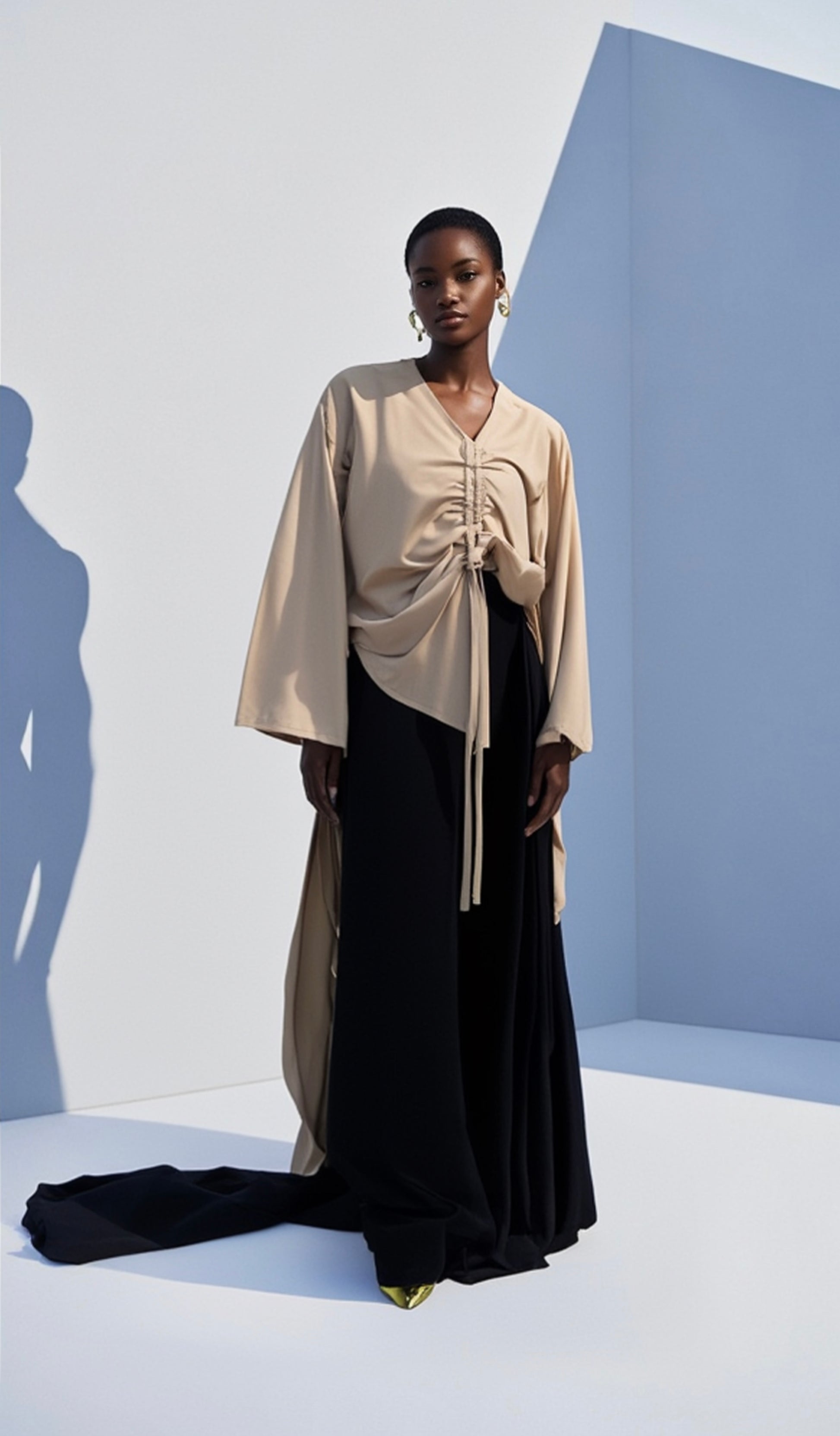 Paired with high-waisted black wide-leg trousers that flow effortlessly, elongating your silhouette and giving that chic, runway-ready stride. The contrast of soft beige against bold black creates timeless drama – polished enough for office power moves, brunch dates, or evening cocktails.