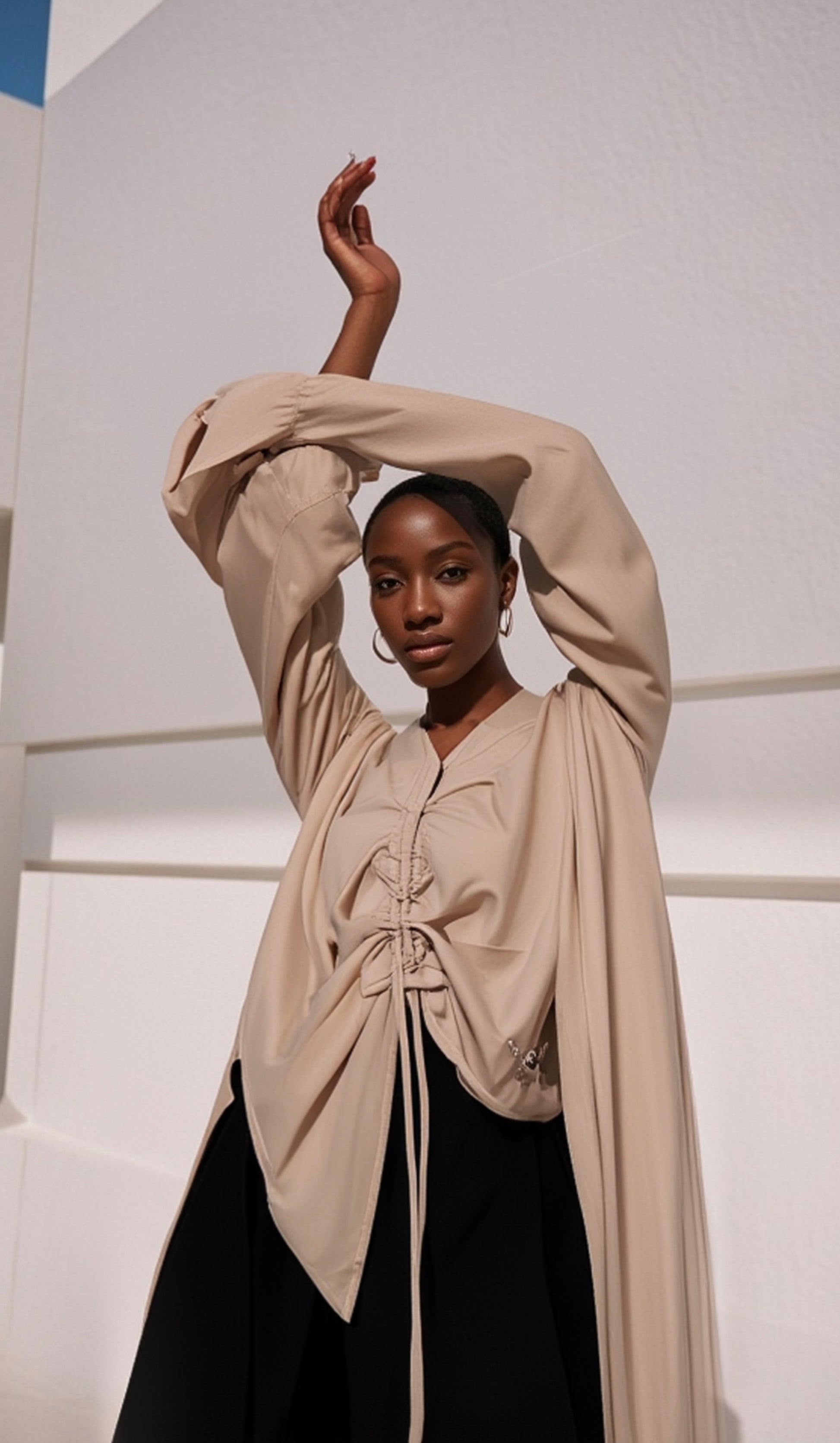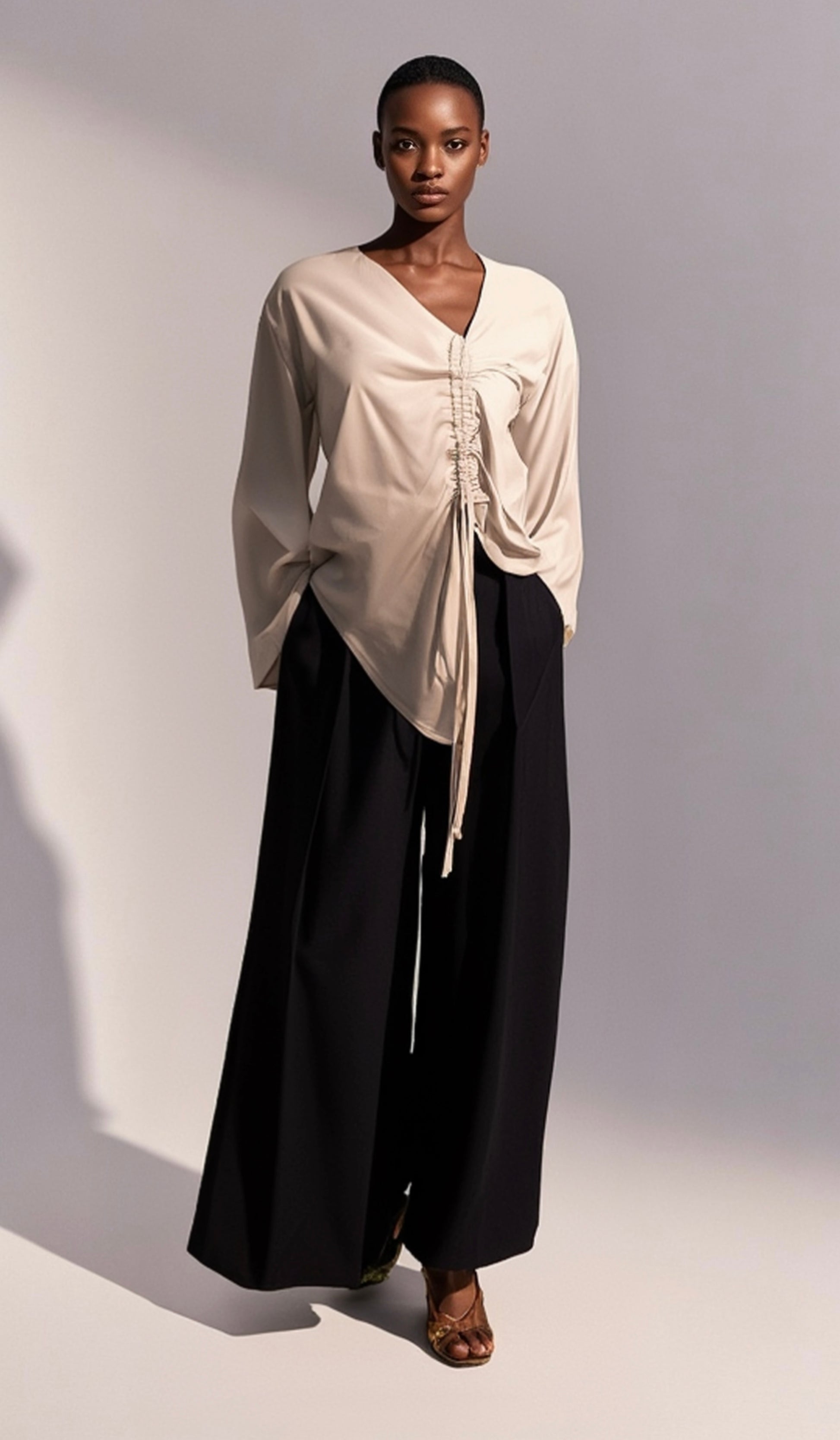 The luxurious beige crepe top features dramatic bishop sleeves, a deep V-neckline, and signature ruched drawstring detailing at the front that cinches your waist for that perfect hourglass illusion. Silky, lightweight, and impossibly soft it drapes beautifully and moves with you.